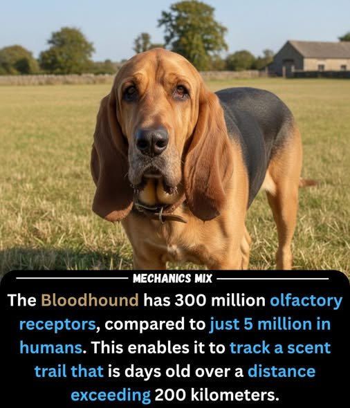 The Bloodhound is nature’s ultimate biological detective, possessing an olfactory system so sophisticated that its testimony is admissible in many courts of law. While a human has about 5 million scent receptors, this elite tracker boasts an astounding 300 million, allowing it to distinguish a single specific scent trail from a chaotic mosaic of environmental odors. Its physical design acts as a specialized tool; those iconic long, drooping ears sweep across the ground as it moves, kicking up microscopic scent particles and funnelling them directly toward its sensitive nose, while the wrinkled skin on its face helps trap those particles for continuous analysis.