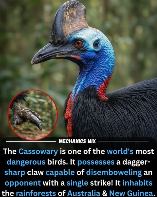 Deep in the ancient rainforests of Australia and New Guinea, there lives a creature that feels like a living relic of the prehistoric past: the Southern Cassowary. Often called the world’s most dangerous bird, this flightless giant stands up to six feet tall, draped in shimmering black feathers and crowned with a mysterious, bony “casque” atop its vibrant blue head. While its striking appearance might command admiration from a distance, its reputation is built on a formidable defense mechanism. Each foot is armed with a razor-sharp, four-inch claw that functions like a literal dagger, capable of delivering a lethal kick that can slice through predators or threats with terrifying speed and precision.