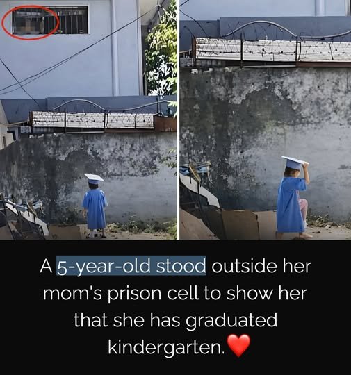 A viral photo from the Philippines shows a moment more powerful than any stage or ceremony. A 5-year-old girl held her kindergarten graduation on a prison sidewalk, dressed in blue, standing just below a barred window so her incarcerated mother could watch.