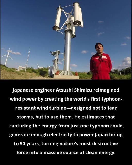 Japanese engineer Atsushi Shimizu rethought wind energy by designing the world’s first typhoon-resistant wind turbine—built to harness storms instead of fearing them. He estimates that the power from a single typhoon could generate enough electricity to supply Japan for up to 50 years, transforming destructive force into clean energy.